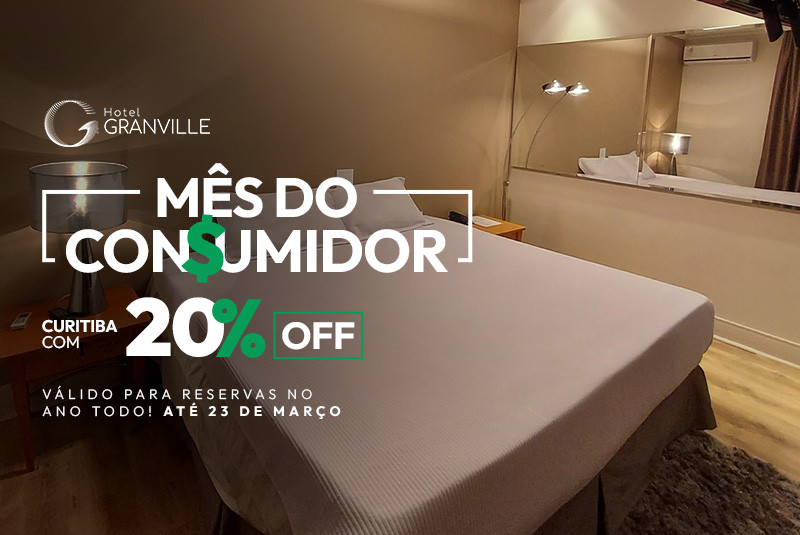 Março é o mês de garantir sua estadia na capital mais charmosa do Brasil com uma economia imperdível! O Hotel Granville entra na celebração do Mês do Consumidor com uma oferta especial: de 09/03 a 23/03, reserve sua hospedagem com 20% de desconto!